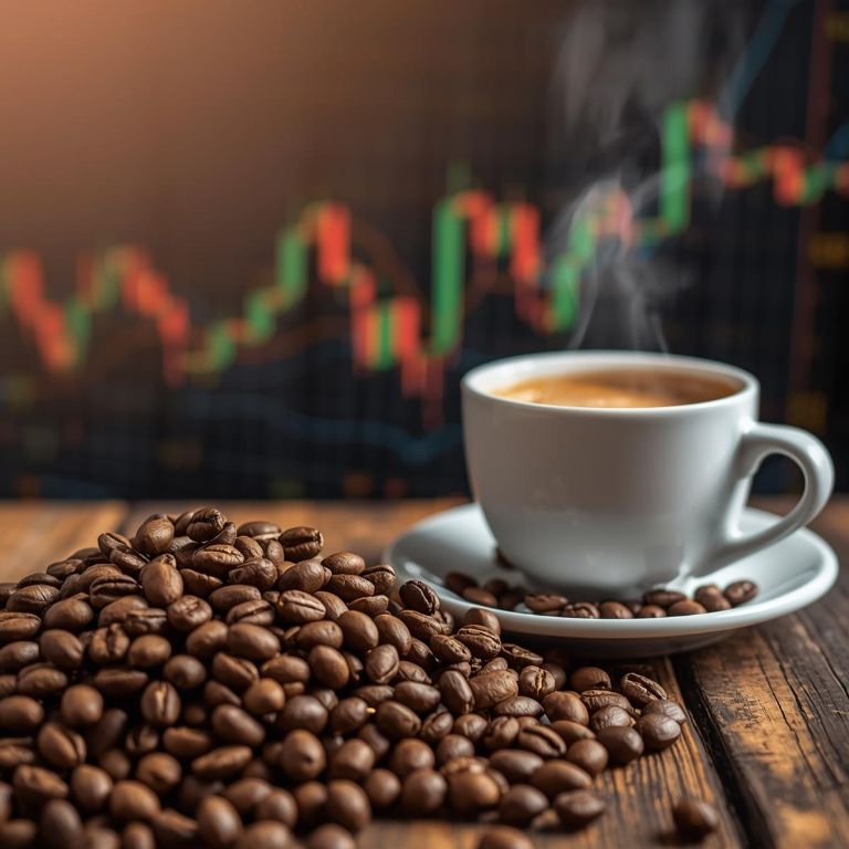 O café arábica cai e opera a 368,50 centavos de dólar por libra-peso, pressionado por um dólar forte e um superávit global projetado para 2025/2026.