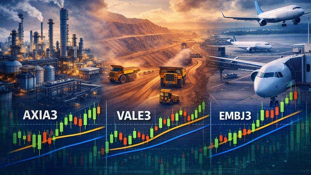 AXIA3 segue no topo do movimento com correção curta; VALE3 oscila em faixa alta acima de EMA50 e SMA200; EMBJ3 acomoda após correção, trabalhando colada à EMA50.