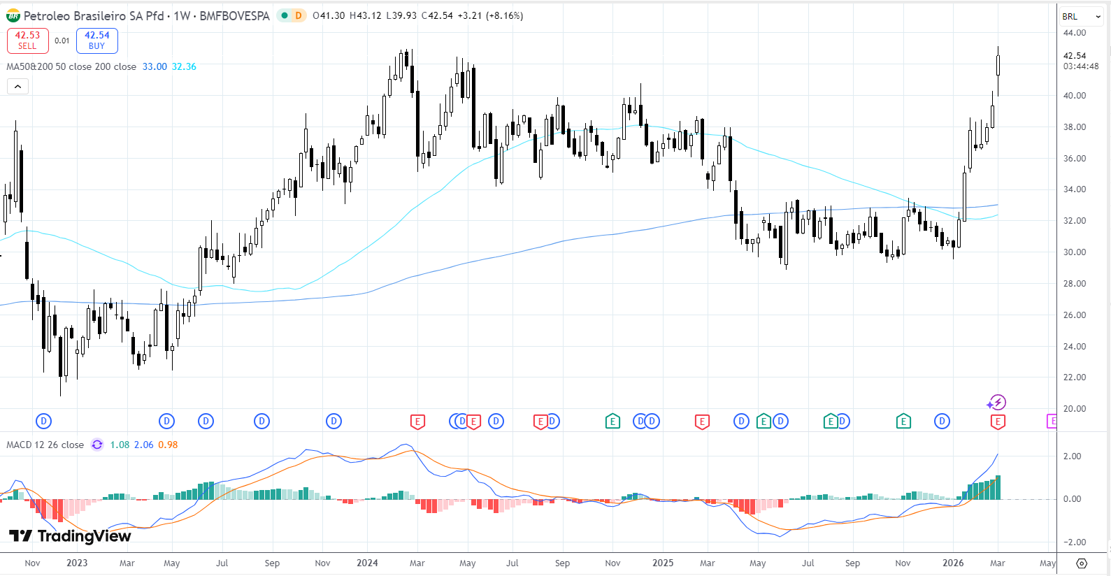 No gráfico semanal, PETR4 fechou a R$ 42,54, depois de trabalhar entre R$ 39,93 na mínima e R$ 43,12 na máxima da semana. O movimento foi forte, com alta semanal de 8,16%, e colocou o papel novamente numa faixa de preço que chama bastante atenção do mercado. A ação está bem acima das médias longas, que aparecem na região de R$ 32,36 e R$ 33,00, o que reforça a leitura de tendência positiva. O MACD segue em terreno favorável, com a linha principal acima da linha de sinal e histograma positivo. Em termos de preço, o gráfico mostra uma Petrobras forte acima de R$ 42, depois de sair de uma base mais perto de R$ 30–32 ao longo dos meses anteriores.