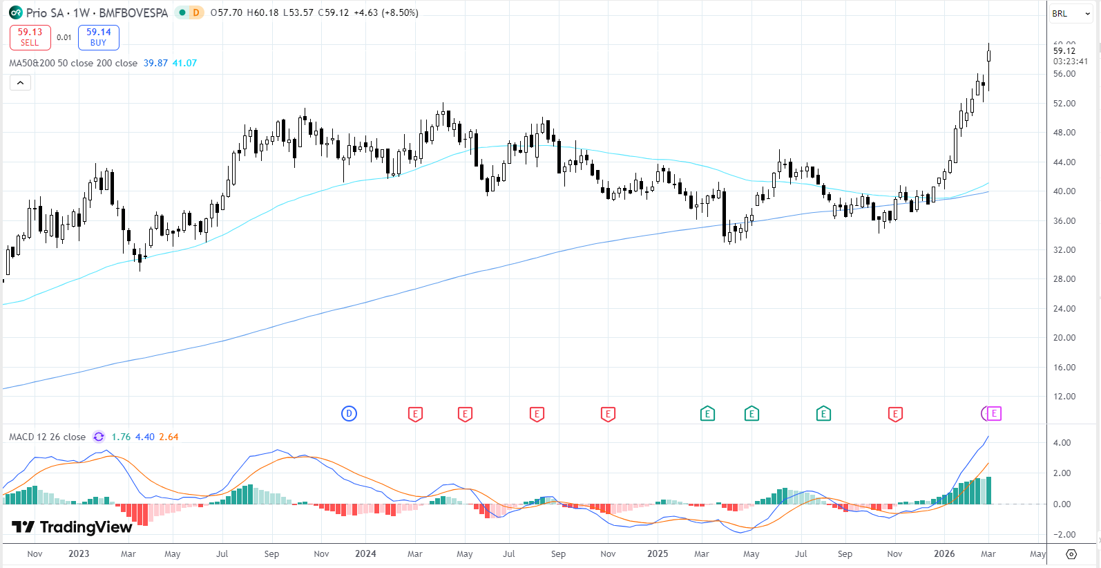 A PRIO3 fechou então a R$ 59,03, com máxima de R$ 60,18 e mínima de R$ 53,57 na semana. Foi uma alta semanal de 8,33%, num movimento bastante forte e com cara de rompimento. O papel está muito acima das médias longas, posicionadas em R$ 39,87 e R$ 41,06, o que deixa clara a distância entre o preço atual e a região em que a ação vinha negociando antes da aceleração recente. Tecnicamente, o mercado está olhando para PRIO como um papel que saiu da faixa de R$ 38–41 e agora tenta se consolidar perto de R$ 59–60. O MACD também confirma esse impulso, com abertura positiva entre as linhas e histograma crescente.