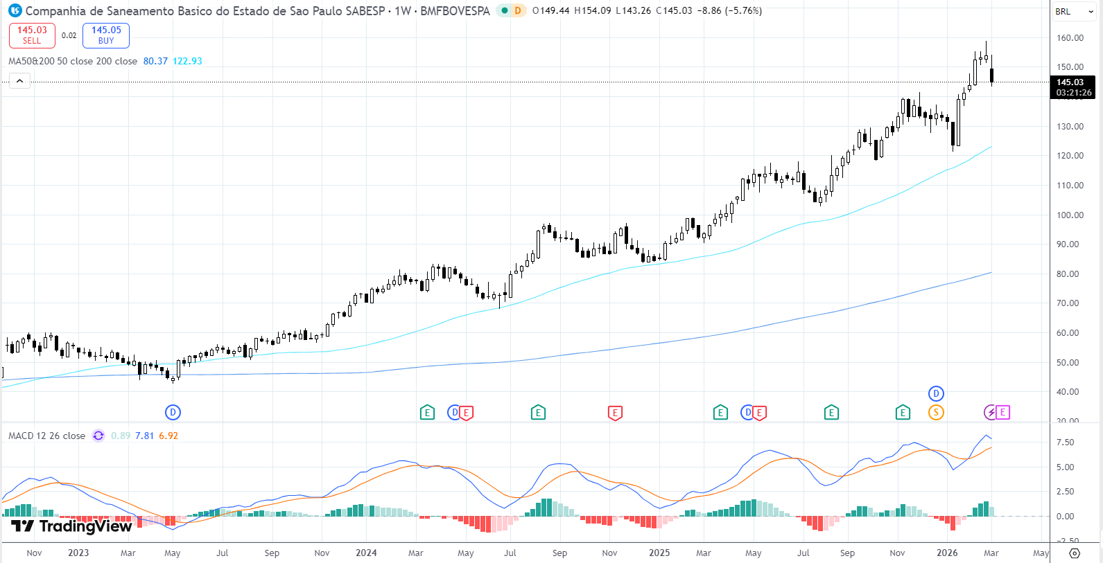 A ação fechou a R$ 145,05, depois de marcar máxima de R$ 154,09 e mínima de R$ 143,26. A queda da semana foi de 5,74%, mas o ponto importante é que o papel continua muito acima das médias longas, que aparecem em R$ 122,93 e R$ 80,37. Isso mostra que, apesar da correção, a estrutura de alta segue preservada. Em termos de preço, Sabesp continua numa faixa muito superior àquela em que negociava há alguns trimestres, e a correção recente aconteceu depois de o papel encostar na região de R$ 154. O MACD permanece positivo, sugerindo mais acomodação de curto prazo do que reversão estrutural da tendência.